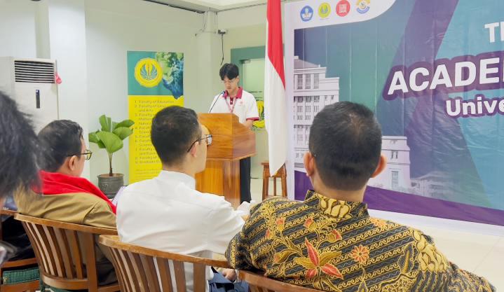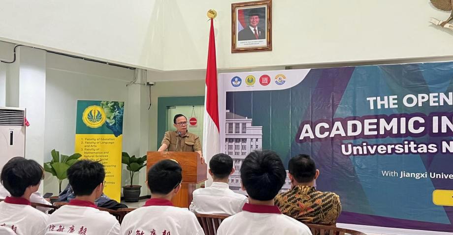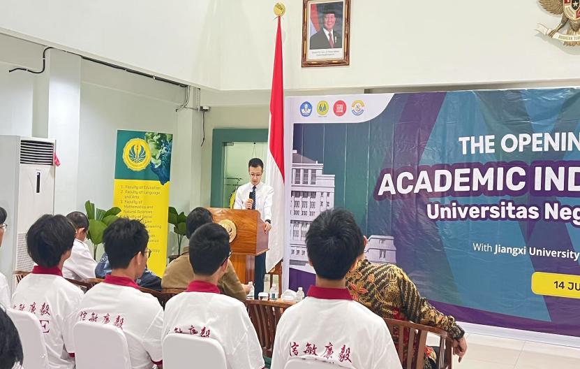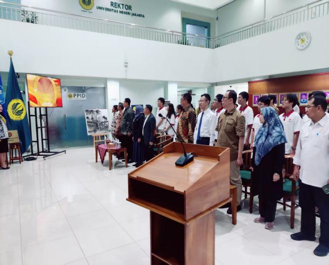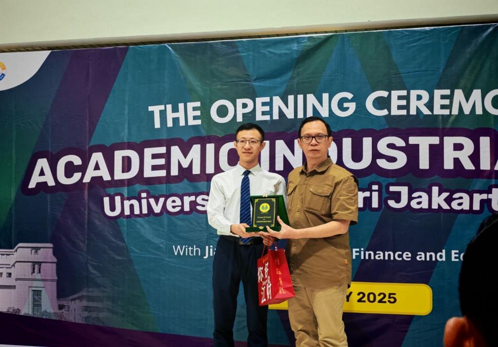 开幕式在两国国歌声中拉开序幕,雅加达国立大学副校长AndiHadiyanto教授、江西财经大学教师孙冒罡博士、雅加达国立大学相关学院负责人及研习团全体成员参加了开班仪式。AndiHadiyanto副校长在致辞中表达了对研习团的热烈欢迎和对未来合作的期待与信心,孙冒罡老师代表学校对东道主的周到安排和热情接待表示衷心感谢,并邀请对方院校师生来我校进行深度交流,队长刘森代表全体学员保证将会认真参与研习项目安排的各项活动。最后,雅加达国立大学校方给研习团成员颁发了胸卡和礼物,两校代表互换了纪念品并合影留念,开幕式圆满结束。