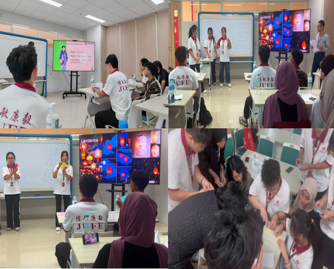 为了与印尼学子进行更深入的学术和文化交流,研习团成员也创新性地组织了一个工作坊。我校学子精心准备,通过击鼓传花小游戏的形式耐心教授印尼学生如何用普通话表达“你好,我叫XXX,我来自印度尼西亚”等实用语句。在折纸教学环节,研习团成员在阐释完灯笼“团圆光明”的意义后,分步指导大家完成灯笼折纸,印尼学生对此展现出极大兴趣并赞叹道:“中文句子原来可以在玩的过程中学会,折纸灯笼也非常有趣,又学到了一招”。