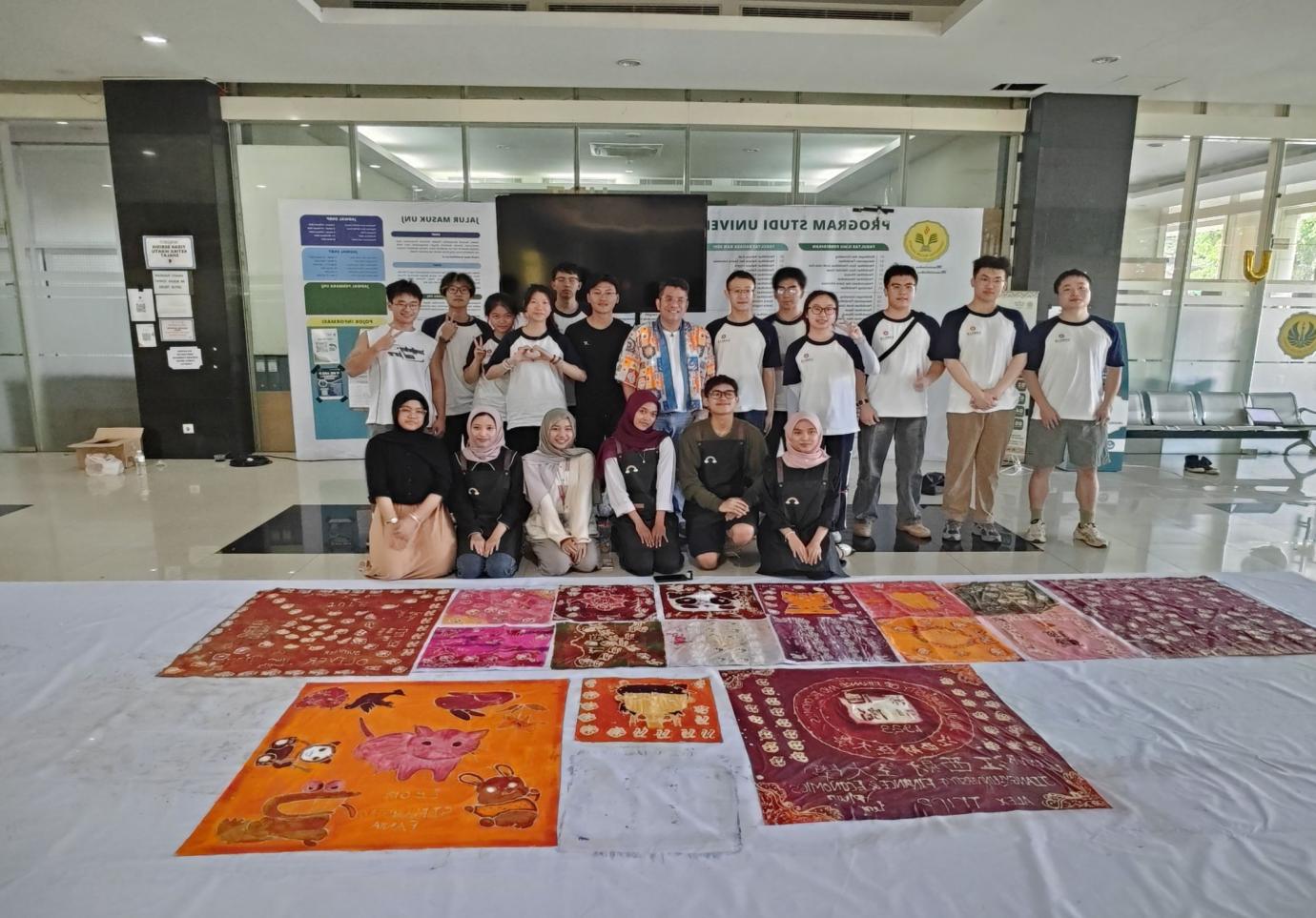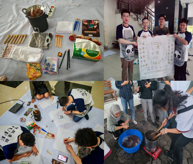 在志愿者的悉心指导下,研习团开启蜡染(Batik)文化深度体验。雅加达国立大学艺术和设计专业的同学系统解说了不同类型蜡染间的差异、核心工艺与工具的使用技巧。在实践环节,学员们齐心协力,亲手在棉布上绘制心仪画像,经历从熔蜡控温到天然染料浸染的全流程实操,最终完成独具风格的蜡染作品。研习团成员反馈,蜡染的每一个步骤都呈现出“世界非遗”的工艺精髓与文化意义,让他们对印尼独特的传统手工技艺有了更深刻的理解。