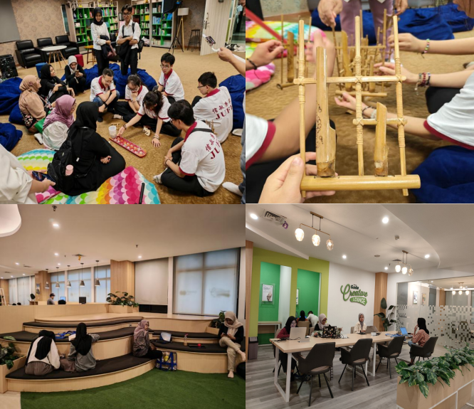 在雅加达国立大学的精心安排下,研习团成员跟随志愿者深入校园,参观了设计独特的图书馆与教学楼,身临其境感受特色文化与校园氛围。在教学楼的文化交流中心,志愿者们现场演示了独具韵味的竹制乐器,并与研习团成员一同体验了充满智慧的传统益智游戏。研习团成员纷纷表示,在实际操作过程中真切感受到了印尼传统艺术的魅力与智慧,也让他们探索未知世界的兴趣更加强烈。